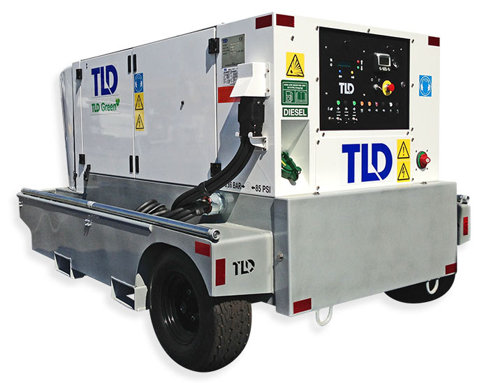 The TLD GPU-406-T-CUP-28 Aircraft Ground Power Unit features an optimized 1,846 RPM brushless revolving field generator, which efficiently produces 60 kVA (60 kW) 400 Hz AC and 28V DC power to start and service AC/DC powered aircraft. Designed with operators in mind, the GPU-406 Ground Power Unit’s full-size performance comes in a compact size, allowing for easier handling and better mobility near aircraft while reduced sound levels ensure customer and passenger comfort. Powder-coated aluminum and fiberglass panels that surround a rugged galvanized steel chassis are a durable, yet lightweight alternative to traditional designs. Mobility is enhanced by a rubber torsion axle, tight turn radius fifth-wheel steering, simple direct-acting brakes and a safe no-drop towbar. The unit’s engine can meet U.S. Tier 4i and EURO emission standards. Other engines options are available that will meet the specific regulatory needs of your geographic location.
