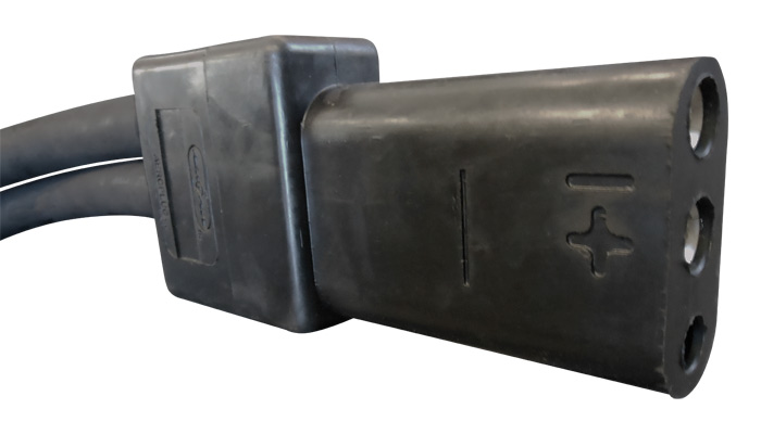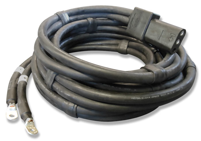Our 28.5V DC Aircraft GPU Cable Assembly consists of (2) insulated 4/0 copper wires bound with a non-metallic band and an attached 3-pole molded aircraft plug/head.