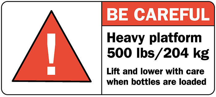 Decal, O2N2, BE CAREFUL: Heavy platform 500lbs, 4.875″ x 2.125″