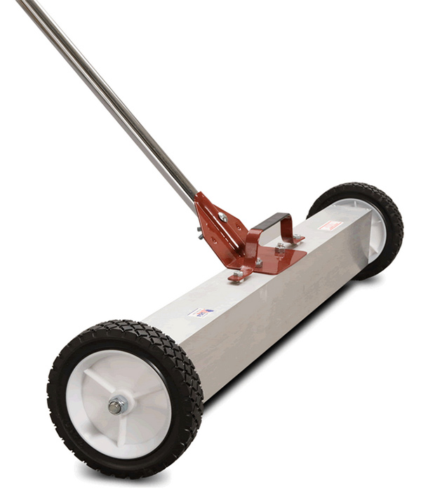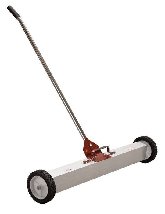 This product is available in four sizes: 24″ (60.96 cm), 30″ (76.2 cm), 36″ (91.44 cm), and 48″ (121.92 cm). The Multi-Surface Magnetic Broom comes with 7″ wheels and a removable handle for easy storage. The optional rake loosens metal debris from grass or gravel, allowing the magnet to snap them up. Powerful magnets are enclosed in a heavy gauge aluminum shell. This magnet works well over concrete, grass, gravel, etc.